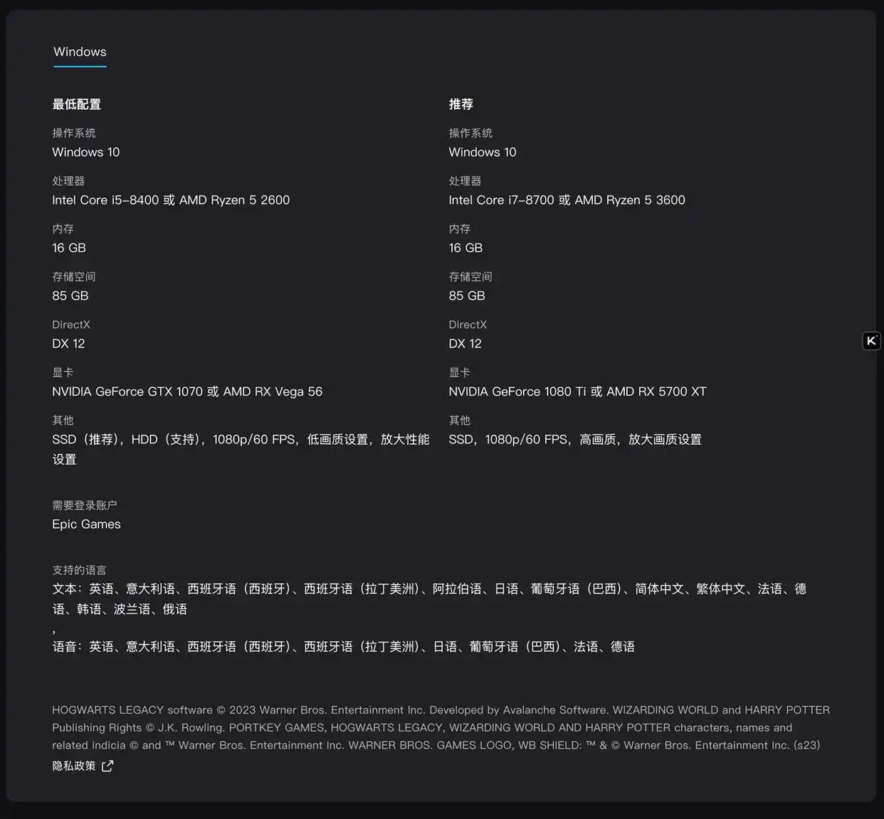 游戏领取链接:https://store.epicgames.com/zh-CN/p/hogwarts-legacy
